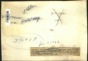 President Mohammed Ayub Kahn of Pakistan reaches his hands toward Prime Minister Lal Bahadur Shastri of India, left, and Premier Lexei N. Kosygin of the Soviet Union as the three met today in a villa at Tashkent, in Soviet Central Asia.