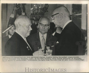 Soviet Premier Nikita Khrushchev congratulates Finnish President Urho Kekkonen, right, on his 60th birthday today during reception in Helsinki. Man at center is unidentified.