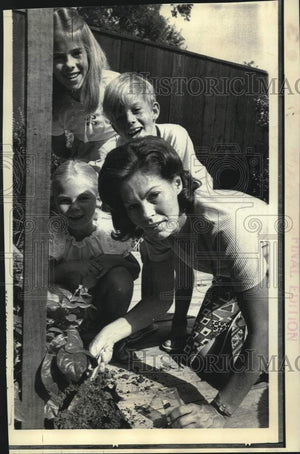 1971 Press Photo Mary Ellen Irwin and children dig for worms in Houston home.