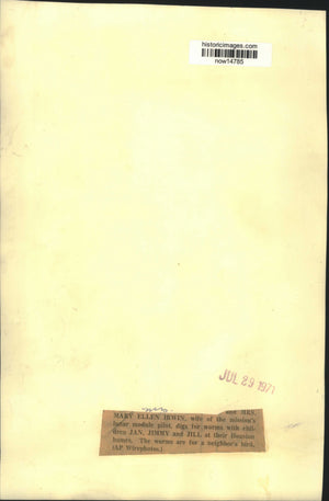 Mary Ellen Irwin, wife of the mission's lunar module pilot, digs for worms with children, Jan, Jimmy and Jill at their Houston homes. The worms are for a neighbor's bird.