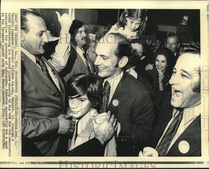 State Senator J. Bennett Johnston (center) follows his son, Bennett, 12, through a crowd celebrating his second place showing in his bid for the Democratic nomination for Governor of Louisiana. Johnston apparently won a spot in the December runoff with Representative Edwin Edwards, D-LA.