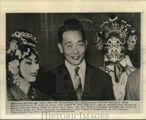 Song Chin Koang, newly arrived Communist China charge d'affaires in Paris, is shown with singer Tu Chin Fang, left, and an unidentified acrobatic dancer from the Peking Opera in Paris last night. The Red Chinese diplomat attended the opera on his first night out after arriving in connection with France's recognition of his country.