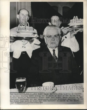 1960 Press Photo John L. Lewis flanked by waiters with cakes at testimony dinner