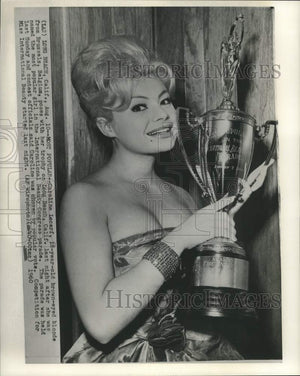 Caroline Lecerf, 18-year-old brown-eyed blonde from Brussels, Belgium, poses with her trophy on Long Beach, California last night after she was named the most popular girl in the International Beauty Contest parade. The parade was held last Sunday and contest officials said Caroline was chosen by popular vote. Competition for Miss International Beauty started last night.