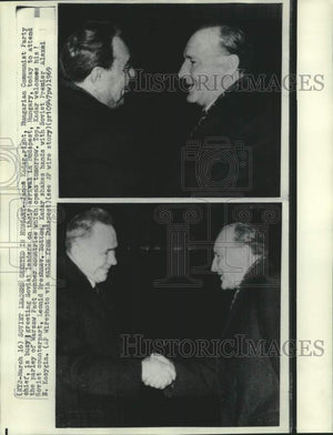 Janoa Kadar, right, Hungarian Communist Party chief, is busy greeting Soviet leaders on their arrival in Budapest, Hungary, today to attend the parley of Warsaw Pact member countries which opens tomorrow. Top, Kadar welcome his Soviet counterpart, Leonid Brezhnev. Bottom, Kadar shakes hands with Soviet Premier Alexei N. Kosygin.