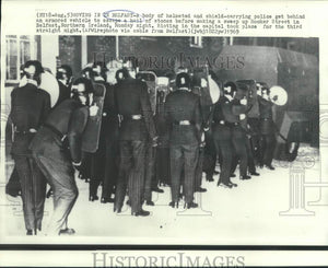1969 Press Photo Helmeted and shielded police behind armored vehicle in Belfast