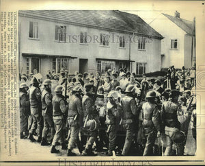 British troops standing shoulder to shoulder slowly retreat under a barrage of jeers and abuse from children in the Creggan area of Londonderry Thursday. There was a lull in violence in the province.