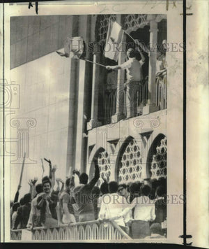 Rightwing students raise the Lebanese flag from a faculty building at American University in Beirut, Lebanon, Wednesday in support of the government against Arab guerrillas. They had battled leftist students whosupport he guerrillas.