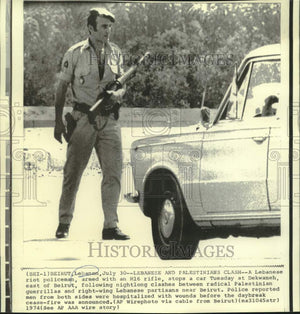 1974 Press Photo Armed Lebanese riot policeman stops car at Dekwaneh - now17768