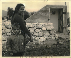 Semcha Bensason, 32, and her 5-year-old son Eilan stand outside the bomb shelter in which they sleep underground each night. For the Benasons and other Israelis living along the Jordan River border with Jordan, such precautions are necessary to escape Arab terrorists attacks.
