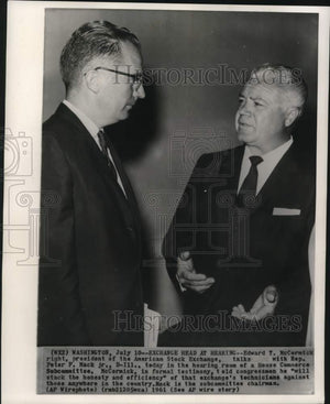 Edward T. McCormick, right, President of the American Stock Exchange, talks with Representative Peter F. Mack,Jr., D-IL, today in the hearing room of a House Commerce Subcommittee. McCormick, in formal testimony told congressmen he "will stack the honesty and efficiency" of that exchange's technicians against those anywhere in the country. Mack is the subcommittee chairman.