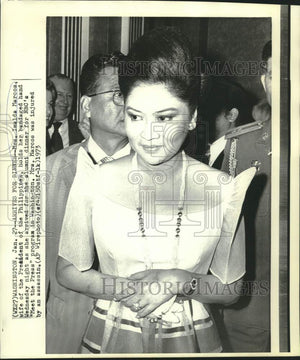 Mrs. Imalda Marcos wife of the President Ferdinand Marcos of the Philippines, holds her bandaged hand Wednesday night as she arrived for the alumni dinner for (NBC) National Broadcasting Company's "Meet the Press" program in Washington, DC. Mrs. Marcos was injured by an assassin.