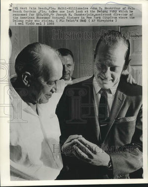 West Palm Beach, Florida multi-millionaire John D. MacArthur of Palm Beach Gardens, Florida takes one last look at the DeLong ruby which he ransomed for $25,000, Dr. Joseph M. Chamberlain, assistant director of the American Museum of Natural History in New York City from where he DeLong ruby was stolen.