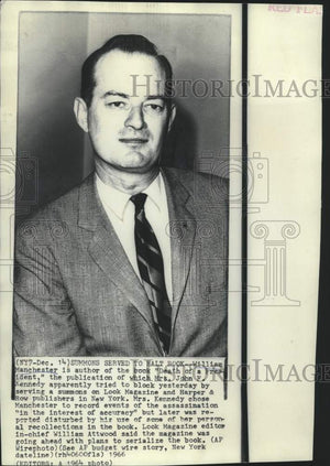 William Manchester is author of the book "The Death of a President," the publication of which Mrs. John F. Kennedy apparently tried to block yesterday by serving a summons on Look Magazine and Harper & Row publishers in New York. Mrs. Kennedy chose Manchester to record events of the assassination "in the interest of accuracy" but later was reported disturbed by the use of some of her personal recollections in the book. Look Magazine editor-in-chief William Atwood said the magazine was going ahead with plans to serialize the book. This is a 1964 photo.