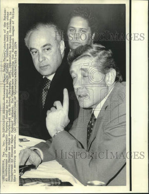 Milwaukee Mayor Henry Maier, chairman of the National Conference of Democratic Mayors, today as he makes a point during a luncheon huddle with other Democratic Mayors as they conferenced with Robert Strauss, left, Democratic National Chairman. In background is Atlanta Mayor Maynard Jackson. The Mayors are attending the National League of Cities that is meeting in Houston.