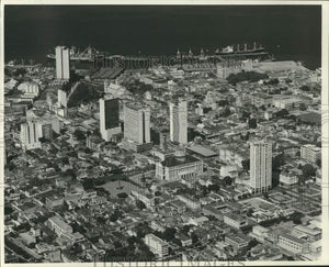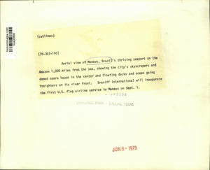 Aerial view of Manaus, Brazil's thriving seaport on the Amazon 1,000 miles from the sea, showing the city's skyscrapers and domed opera house in the center and floating docks and ocean going freighters on its river front. Braniff International will inaugurate the first U.S. flag airline service to Manaus on September 1.
