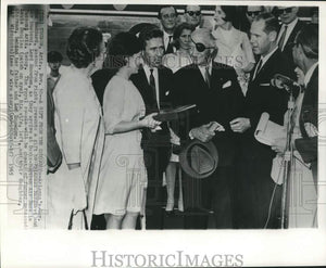 Arizona's Governor Sam Goddard, second from right, presents a gift to Princess Margaret and her husband, Lord Snowdon, as they arrive at Davis-Monthan Air Base in Tucson, Arizona today. The royal couple will be guest of former ambassador Lewis Douglas (patch on eye), his wife, left, and their daughter, Sharman, behind her father and Lord Snowdon.