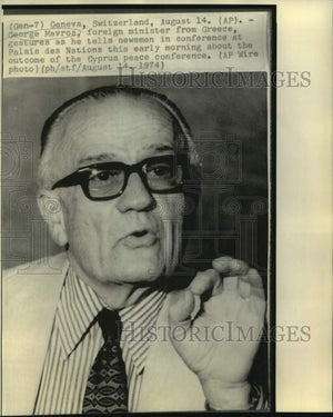 George Mavros, foreign minister from Greece, gestures as he tells newsmen in conference at Palais des Nations this early morning about the outcome of the Cyprus peace conference.