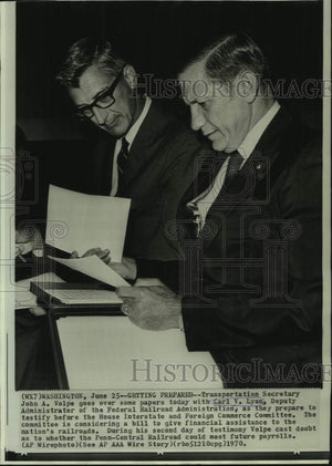 1970 Press Photo Transportation officials Volpe and Carl Lyon prepare to testify