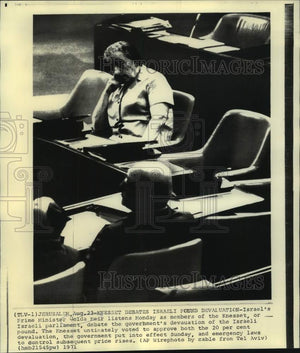 Israel's Prime Minister Golda Meir listens Monday as members of the Knesset, or Israeli parliament, debate the government's devaluation of the Israeli pound. The Knesset ultimately voted to approve both the 20 per cent devaluation, the government put into effect Sunday, and emergency laws to control subsequent price rises.