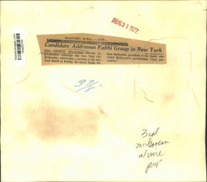 Senator George McGovern carried his presidential campaign into New York City Wednesday, addressing a meeting of the New York Board of Rabbis. He meets Rabbi William Berkowitz, president of the board, who called McGovern's presentation "very perceptive."