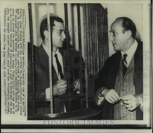 Filippo Melodia, 23-year-old son of a wealthy family, shown talking with his attorney Mr. Pagusa, right, while behind bars in Trapani, Italy, was today convicted of kidnapping and raping the reluctant girl he wanted to marry. Court sentenced Melodia to 11 years in prison for carrying off Franca Viola, 18. His act was part of an old Sicilian tradition of convincing a girl to marry. Had she said yes, the charges against Melodia would have been dropped. She refused.