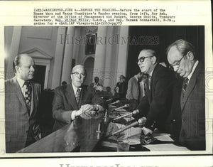 Before the start of the House Ways and Means Committee's Monday session, from left, Roy Ash, Director of the Office of Management and Budget; George Shultz, Treasury Secretary; Representative Wilbur Mills, D-AR; and Representative Herman Schneebeli, R-PA, gather for a chat.