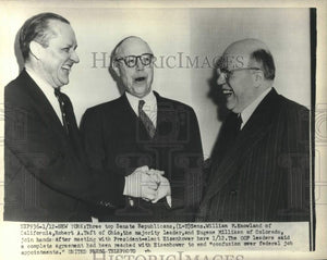 New York. Three top Senate Republicans, (L-R) Senators William F. Knowland of California, Robert A. Taft of Ohio, the Majority Leader and Eugene Milliken of Colorado, join hands after meeting with President-elect Eisenhower here 1/12. The GOP leaders said a complete agreement had been reached with Eisenhower to end "confusion over federal job appointments."