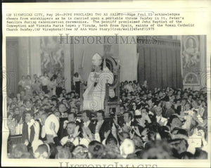 Pope Paul VI acknowledges cheers from worshippers as he is carried upon a portable throne Sunday in St. Peter's Basilica during canonization ceremonies. The Pontiff proclaimed John Baptist of the Conception and Vicenta Maria Lopez y Vicuna, both from Spain, saints of the Roman Catholic Church Sunday.