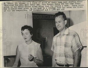 Mr. and Mrs. M. Owens, Jr. appear in a state of shock at their home here shortly after receiving the news that their son, John Manson Owens III had been found alive in the Grand Canyon after being lost for nearly a week. Young Owens had almost been given up for lost in a tragedy that had taken the lives of his two companions.