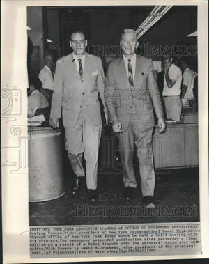 Bertram Powers, right, President of New York Typographical Local No. 6, walks through office of New York Post today where he held a brief meeting with his printers. The newspaper suspended publication after yesterday's final edition as a result of a labor dispute with the printers' union over automation. With Powers is David W. Crockett, vice president of the printers' local.