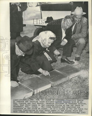 President Lyndon B. Johnson and Canadian Prime Minister Lester Pearson look on as Mrs. Pearson and Paul Martin, Canadian Minister of External Affairs, left, sign their names in the concrete blocks at the LBJ Ranch in Stonewall, Texas, today. The Prime Minister had completed his signature on the block at right. It is a custom at the LBJ Ranch for visiting dignitaries to sign their names in the blocks which are then placed in the patio area.