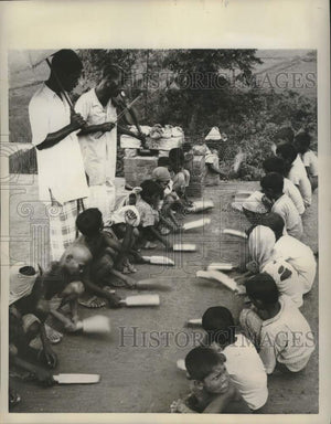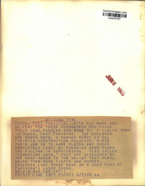 It's all work and no play for these youngsters who pound their hand paddles and sing to a violin tune in Dacca, East Pakistan. The children are Mason Boys, a common sight at all Pakistan construction projects, where their job is to make floors and roofs completely level by pounding down bumps and filling in depressions. Also called "Levelling Boys." They are serenaded by the head mason in the belief that music helps them work faster and harder. Children like these make up a good part of Pakistan's labor force.