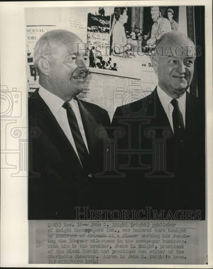 John S. Knight (right) publisher of Knight Newspapers Incorporated, was honored here tonight by hundreds of friends at a dinner marking his reaching the 50-year milestone in the newspaper business. With him is his brother, James L. Knight, President of the Miami Herald and President and Editor of the Charlotte Observer. Akron is John S. Knight's home.