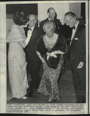 President and Mrs. Johnson welcome Chancellor and Mrs. Josef Klaus at the White House north portico tonight for a state dinner in honor of the visitors from Austria. In background is Angier Biddle Duke, chief of protocol.