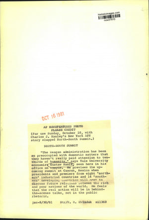 "The Reagan administration has been so preoccupied with domestic matters that they haven't really paid attention to two-thirds of humanity," says Yale University economist Gustav Rands, seen here in his office on campus. He previews the upcoming summit at Cancun, Mexico when presidents and premiers from eight "northern" industrial countries and 14 "southern" developing countries will meet to discuss future relations between the rich and poor nations of the world. He feels that the real action will be in behind-the-scenes talks, not in the public rhetoric.