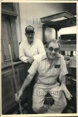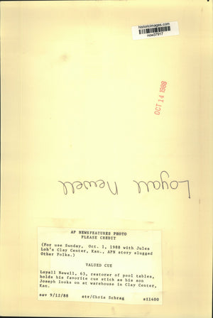 1988 Press Photo Pool table restorer Loyall Newell with cue as son watches