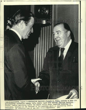 Russell E. Train, nominee to head the Environmental Protection Agency, left, shakes hands with Senator Jennings Randolph, D-WVA, before testifying before the Senate Public Works Committee Wednesday in Washington. Randolph is the chairman of the committee which is considering Train's nomination.