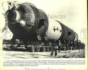 It took a 144-wheel dolly to carry this and five other huge atmospheric desulfurization reactors one at a time from a river dock on the Texas Gulf Coast to Phillips Petroleum Company's Sweeny, Texas refinery. The reactors, which remove impurities from crude oil, each weigh more than 660 tons. The expansion, scheduled for completion in mid-1980, will nearly double the capacity of the refinery and downstream processing facilities to some 190,000 barrels of crude per day.
