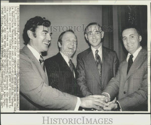 Representative Benjamin Rosenthal, D-NY, joins hands with fellow congressmen after the House voted, in Washington Wednesday to cut off United States military aid to Turkey December 10 or sooner if Turkey sends any more arms or equipment to its occupation forces on Cyprus. Rosenthal sponsored the amendment against any new arms going to Cyprus. From left are: Representatives Peter Kyros, D-ME; John Brademas, D-IN, Rosenthal and Paul Sar