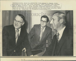 Robert H. Haack, right, President of the New York Stock Exchange, talks Tuesday with Chairman John E. Moss, D-CA, left, and Representative John Y. McCollister, R-NE, before testifying at a House Commerce Committee hearing in Washington. Haack was on hand to discuss problems in the securities industry, under study by the committee.