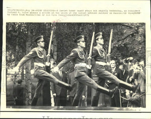 Moscow, May 24 - High steppers - A Soviet honor guard steps out smartly Wednesday, as President Richard M. Nixon places a wreath at the grave of the Soviet unknown soldier in Moscow.