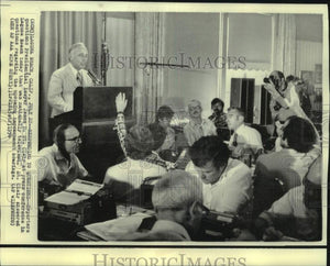 Reporters question Presidential lawyer James D. St. Clair, CA. Reporters questions Presidential lawyer James D. St. Clair at press conference in Laguna Beach today that was nationally televised. St. Clair answered questions regarding the upcoming impeachment hearings. California
