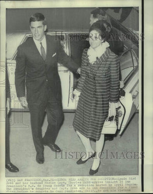 San Francisco, March 21 - Lynda Bird arrives for reception - Lynda Bird Robb and her husband Marine Captain Charles Robb arrive tonight at San Francisco's M.H. de Young Museum for a reception hosted by Cyril Magnin. The President's daughter and Captain Robb are in San Francisco for a final fling before he reports to Camp Pendleton, California, to get his Vietnam assignment.