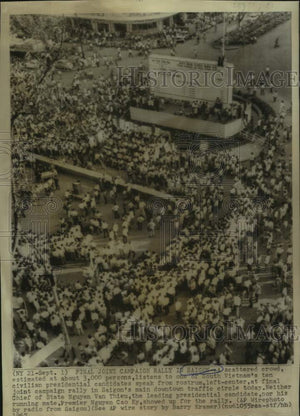 Final joint campaign rally in Saigon - A scattered crowd estimated at about 3,000 persons listens to one of South Vietnam's ten civilian presidential candidates speak from rostrum, left-center, at final joint campaign rally in Saigon's main downtown traffic circle today. Neither Chief of State Nguyen Van Thieu, the leading presidential candidate, nor his running mate Premier Nguyen Cao Ky, showed up for the rally.