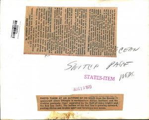 Photo taken at an altitude of 390 miles from the Gemini 11 spacecraft shows Ethiopia in northeastern Africa (bottom) and the Arabian peninsula (top) separated by the Gulf of Aden (right) and the Red Sea (left). The bottom of the Red Sea is growing outward, pushing Africa and Arabia apart and forming a new ocean. According to Haroun Tazieff, a Belgian volcano expert, the Red Sea, which separates the two land masses, is widening into an ocean.