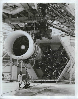 1975 Press Photo General Electric tests CF6 commercial jet engine against fans