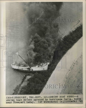 A shrimp boat driven aground by Hurricane Carla, burns near Freeport today.