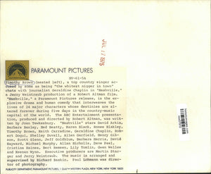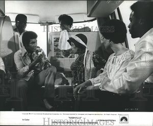 "Nashville" - Timothy Brown (seated left), a top country singer accused by some as being "the whitest nigger in town" chats with journalist Geraldine Chaplin in "Nashville," a Jerry Weintraub production of a Robert Altman film. "Nashville," a Paramount Pictures release, is the explosive drama and human comedy that interweaves the lives of 24 major characters whose destinies are altered forever during five days in the country-music capital of the world. The ABC Entertainment presentation, produced and directed by Robert Altman, was written by Joan Tewkesbury. "Nashville" stars David Arkin, Barbara Baxley, Ned Beatty, Karen Black, Ronee Blakley, Timothy Brown, Keith Carradine, Geraldine Chaplin, Robert Doqui, Shelley Duvall, Allen Garfield, Henry Gibson, Scott Glenn, Jeff Goldblum, Barbara Harris, David Hayward, Michael Murphy, Allan Nicholls, Dave Peel, Cristina Raines, Bert Remsen, Lily Tomlin, Gwen Welles and Keenan Wynn. Executive producers are Martin Starger and Jerry Weintraub. The music is arranged and supervised by Richard Baskin. Paul Lohmann was director of photography.