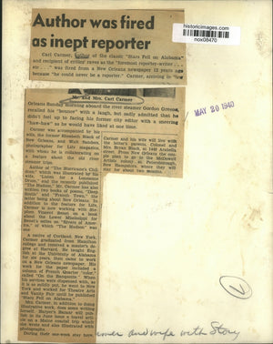 Carl Carmer, author of the classic 'Stars Fell on Alabama" and recipient of critics' raves as the "foremost reporter-writer...etc..." was fired from a New Orleans newspaper 12 years ago because "he could never be a reporter." Carmer, arriving in New Orleans Sunday morning aboard the river steamer Gordon Greene, recalled his "bounce" with a laugh, but sadly admitted that he didn't feel up to facing his former city editor with a sneering "haw-haw" as he would have liked at one time. Carmer was accompanied by his wife, the former Elizabeth Black of New Orleans, and Walt Sanders, photographer for Life magazine, with whom he is collaborating on a feature about the old river steamer trips.